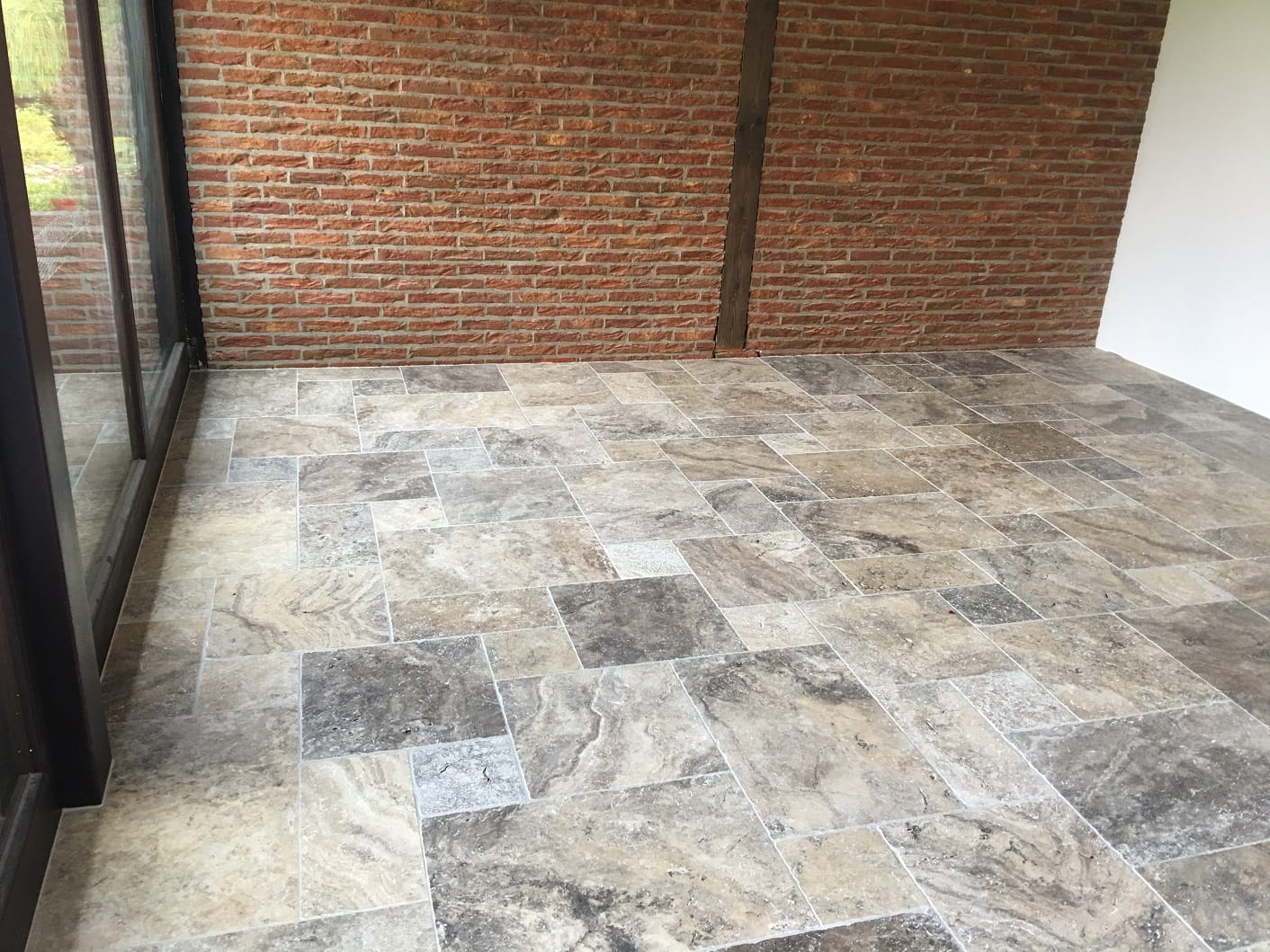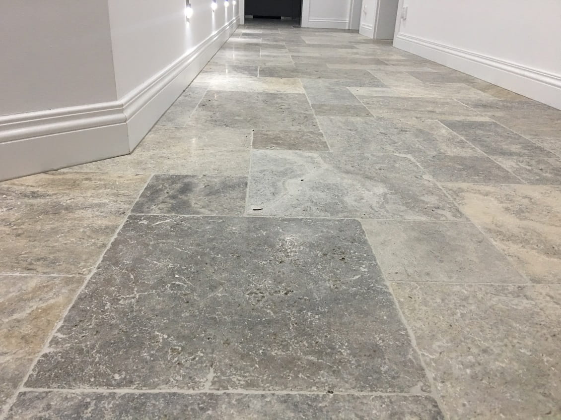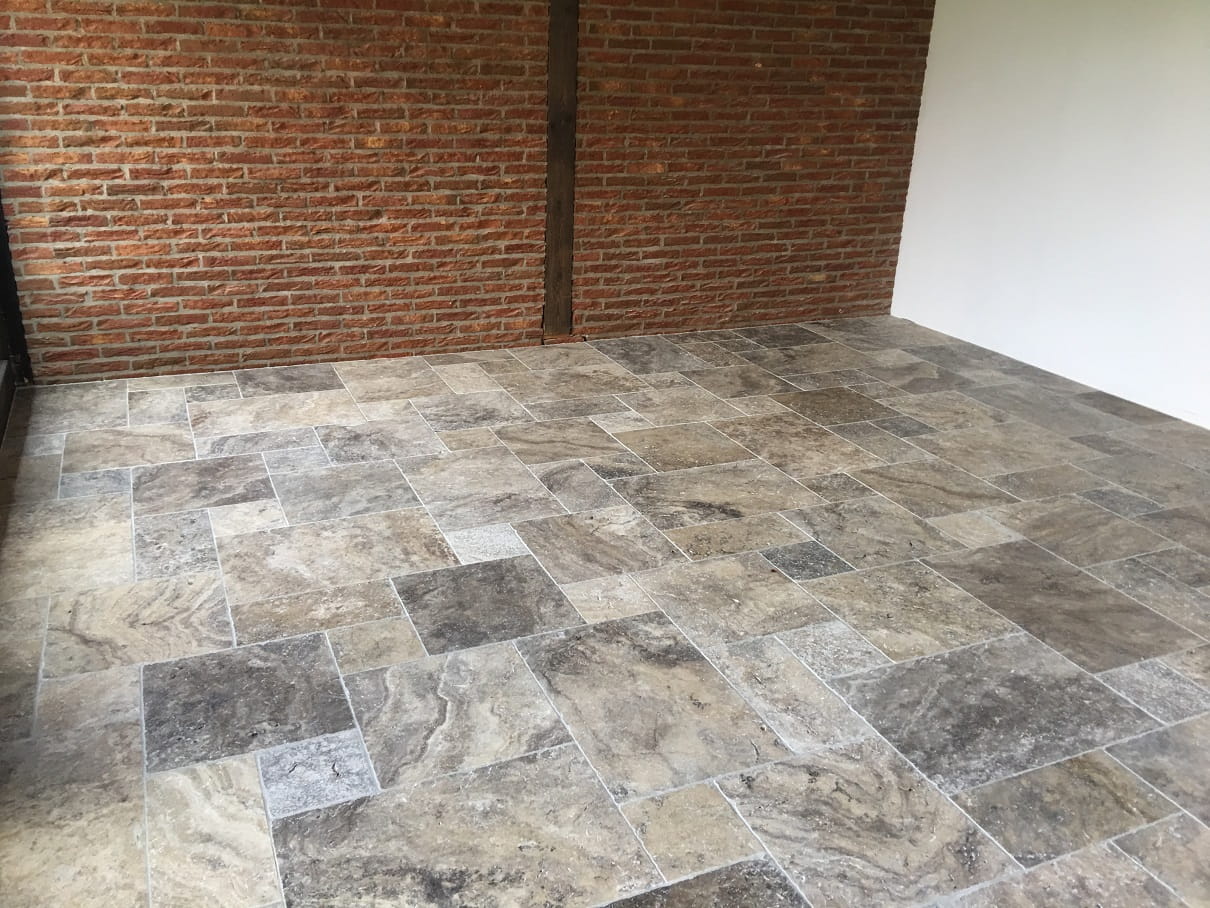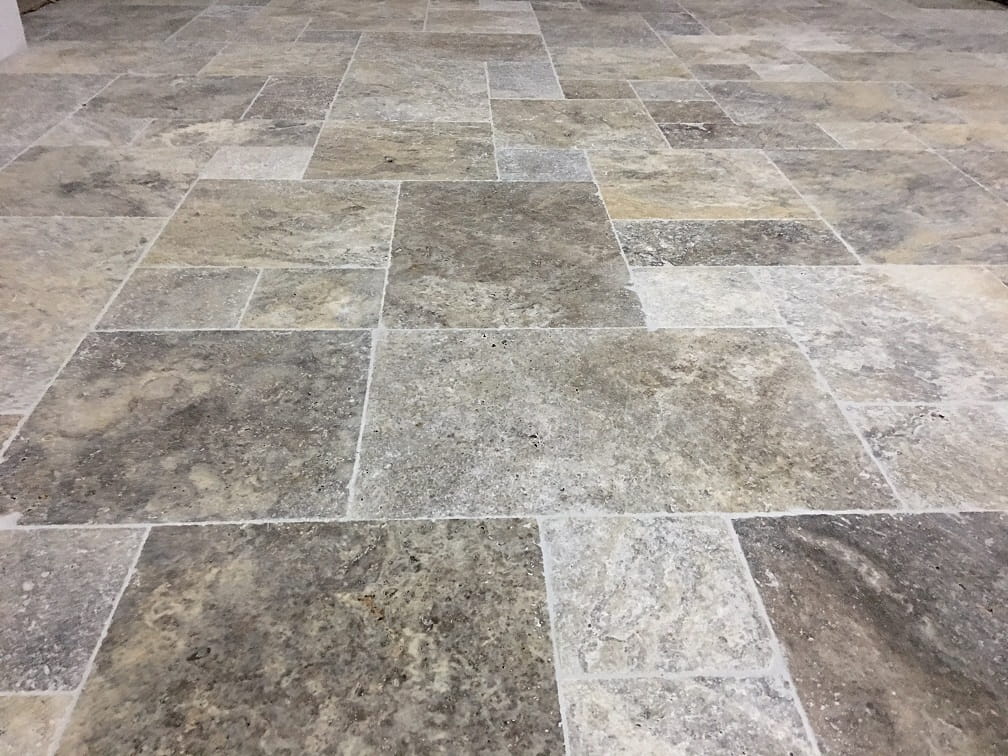 Płytki Trawertyn Silver Ash French Pattern 3cm - Elegancki Układ Rzymski z Naturalnym Pięknem Szarości