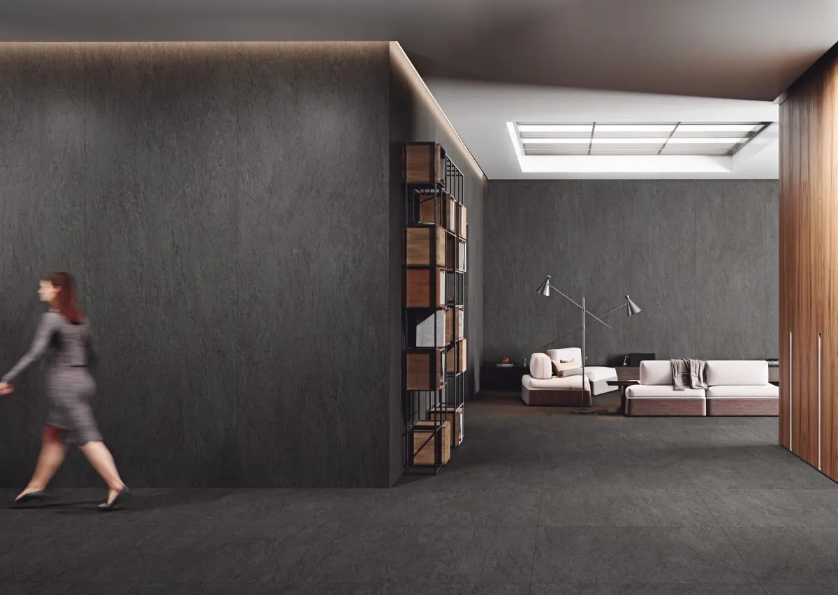 3. Podłogi: Odporność na ścieranie i zarysowania czyni Basaltina idealnym materiałem na podłogi. Matowa powierzchnia dodaje elegancji i sprawia, że wnętrza nabierają przytulnego, ciepłego charakteru. Ze względu na dostępność dużych formatów płyt, możliwe jest uzyskanie niemal bezszwowej powierzchni, co dodatkowo podkreśla nowoczesny charakter przestrzeni. Idealnie sprawdza się w miejscach o dużym natężeniu ruchu, takich jak hotele, muzea, sklepy czy bary.