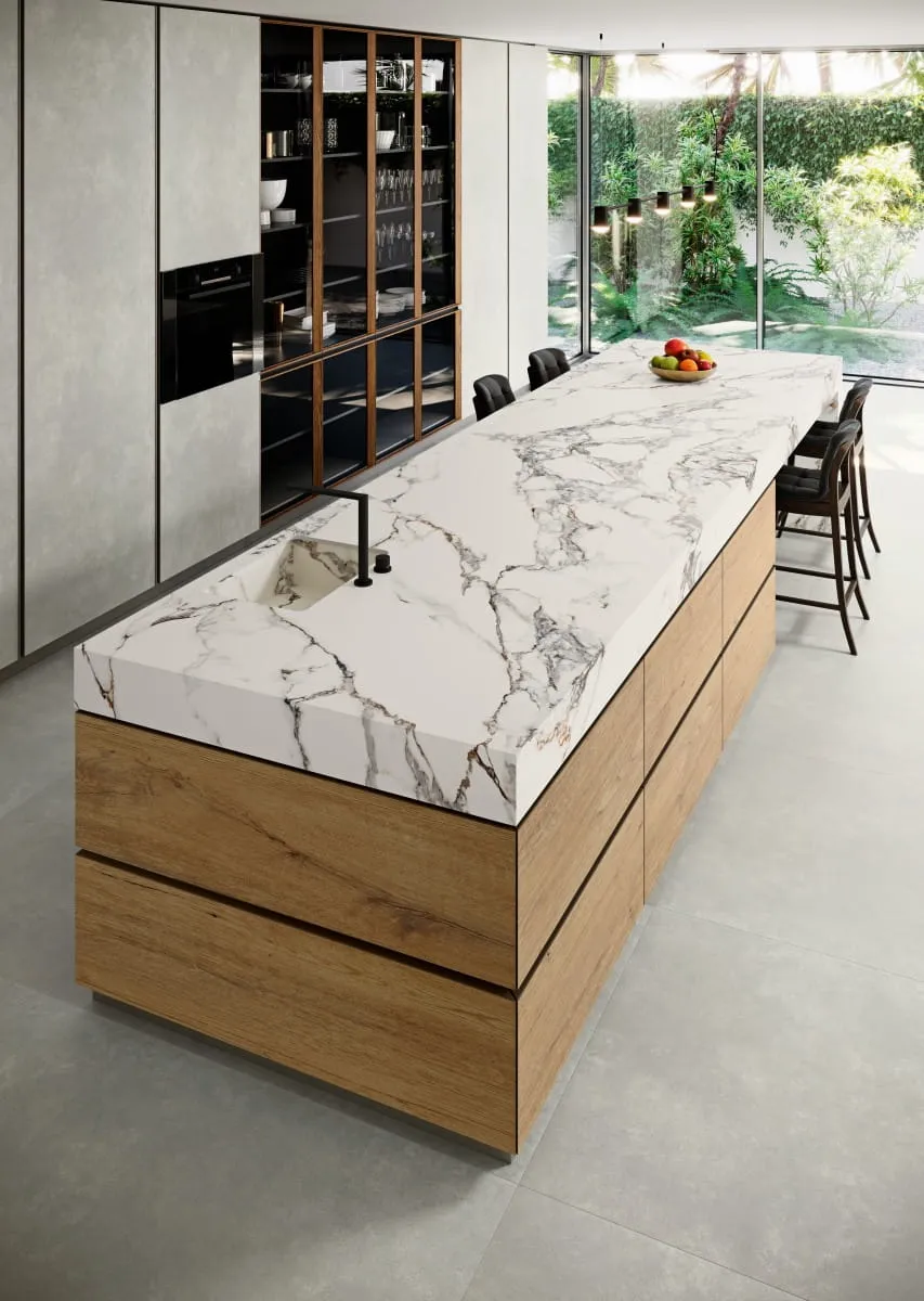 Jednym z najnowszych trendów w aranżacji wnętrz jest wykorzystanie spieków kwarcowych na blaty kuchenne oraz stoły. Calacata Vaglie, dostępna w grubszej wersji, doskonale sprawdzi się w tej roli. Spiek kwarcowy jest materiałem niezwykle odpornym na zarysowania, działanie wysokich temperatur oraz chemikaliów, co sprawia, że jest idealnym wyborem do kuchni.