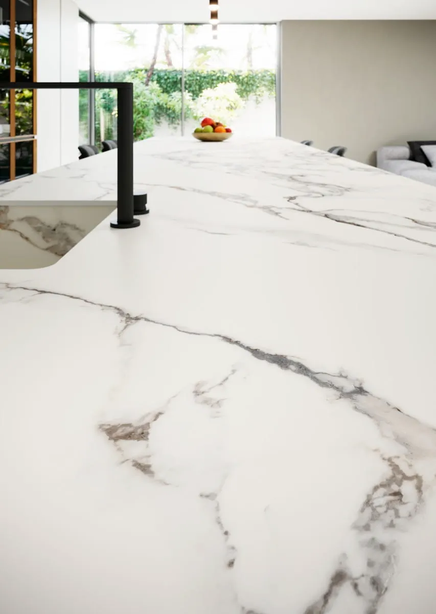 Jednym z najnowszych trendów w aranżacji wnętrz jest wykorzystanie spieków kwarcowych na blaty kuchenne oraz stoły. Calacata Vaglie, dostępna w grubszej wersji, doskonale sprawdzi się w tej roli. Spiek kwarcowy jest materiałem niezwykle odpornym na zarysowania, działanie wysokich temperatur oraz chemikaliów, co sprawia, że jest idealnym wyborem do kuchni.