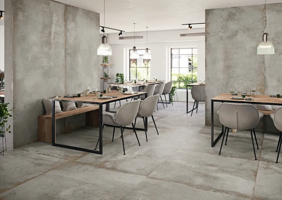 Metalowe akcenty, takie jak stalowe ramy okienne czy metalowe meble, świetnie współgrają z industrialnym stylem płyty Distrito. W szczególności kolor Iron, z jego niebiesko-szarym odcieniem, tworzy spójną kompozycję z metalowymi elementami, podkreślając surowy charakter wnętrza.