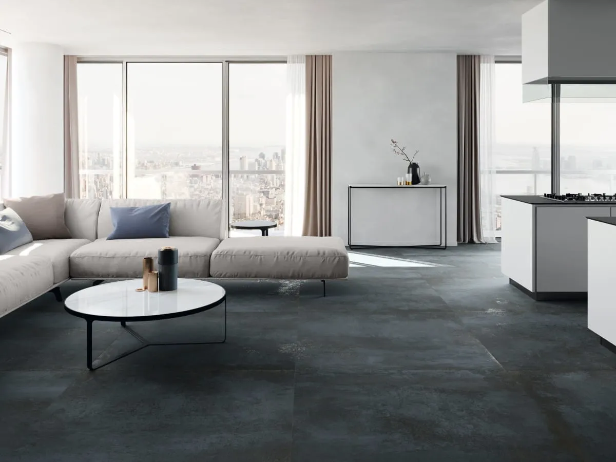 Metalowe akcenty, takie jak stalowe ramy okienne czy metalowe meble, świetnie współgrają z industrialnym stylem płyty Distrito. W szczególności kolor Iron, z jego niebiesko-szarym odcieniem, tworzy spójną kompozycję z metalowymi elementami, podkreślając surowy charakter wnętrza.