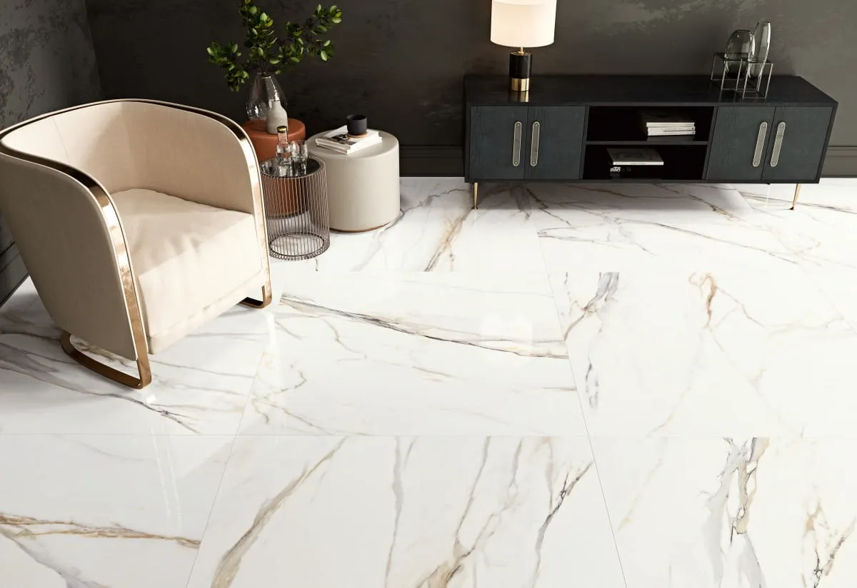 Płytki Calacata Gold w wersji polerowanej dodatkowo wyróżniają się wysokim połyskiem, który wspaniale odbija światło, nadając pomieszczeniom luksusowego blasku i optycznie powiększając przestrzeń. Dzięki tej cechy idealnie nadają się do eleganckich salonów, holi czy łazienek, gdzie istotne jest stworzenie przestronnych i pełnych światła wnętrz. Polerowana powierzchnia płytki jest również łatwa do utrzymania w czystości, co czyni ją praktycznym wyborem do takich pomieszczeń jak kuchnie czy łazienki.