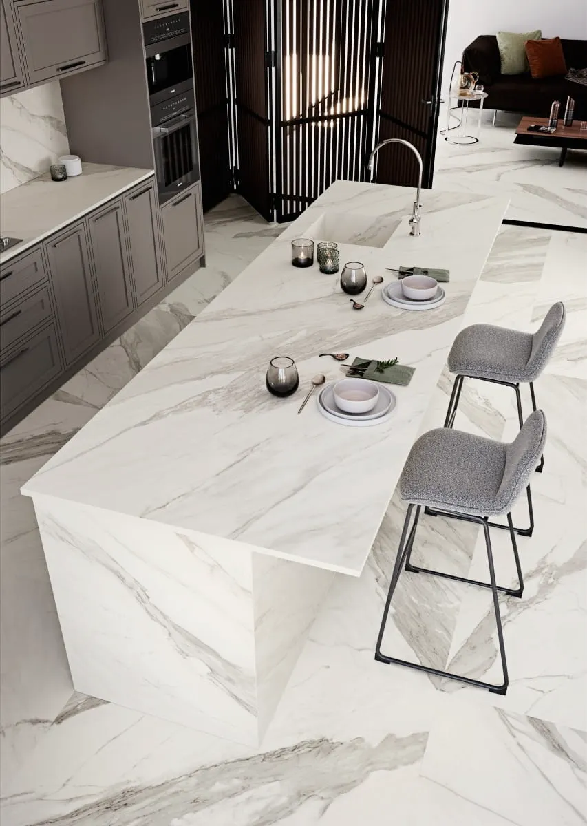 Wnętrza wykończone spiekami Calacata Marble zyskują na elegancji i przestronności. Doskonale nadają się do: