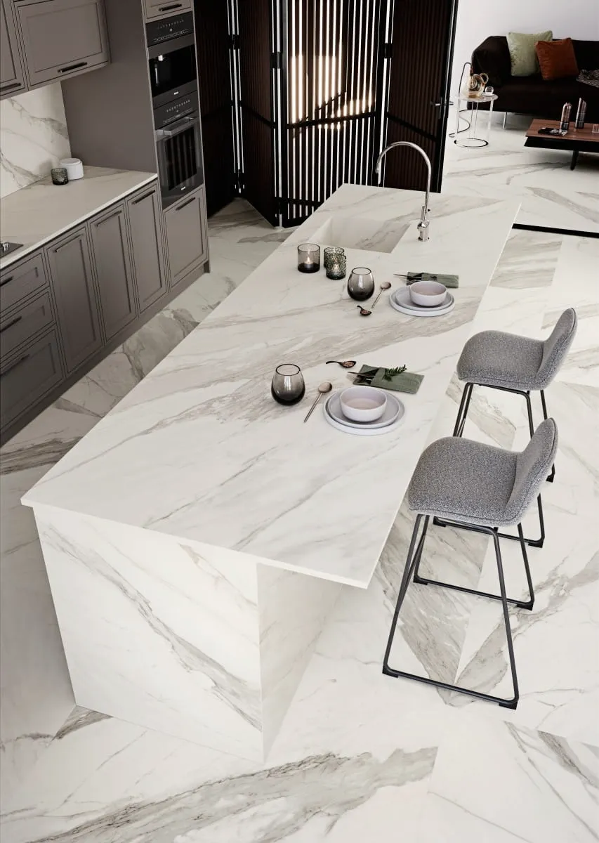 Wnętrza wykończone spiekami Calacata Marble w wersji matowej zyskują na elegancji i przytulności. Doskonale nadają się do: