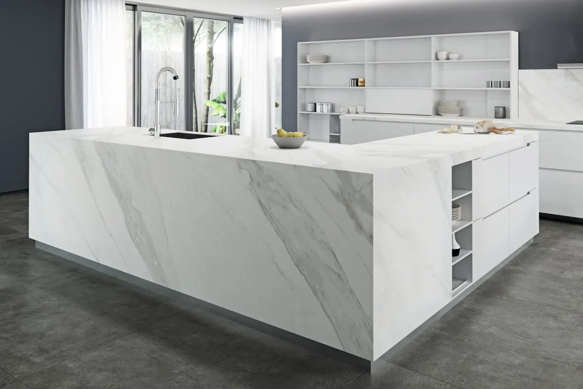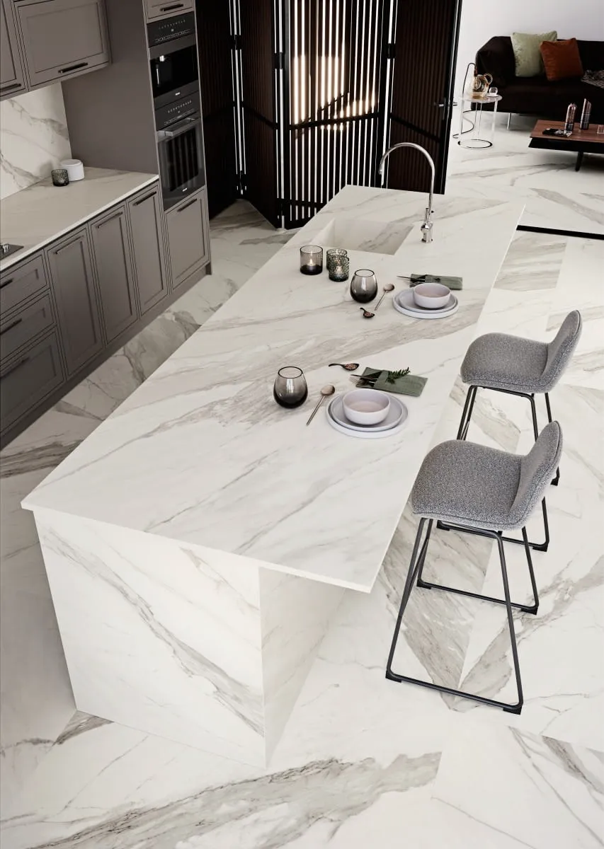 Wnętrza wykończone spiekami Calacata Marble zyskują na elegancji i przestronności. Doskonale nadają się do: