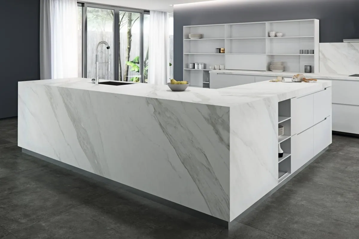 Wnętrza wykończone spiekami Calacata Marble w wersji matowej zyskują na elegancji i przytulności. Doskonale nadają się do: