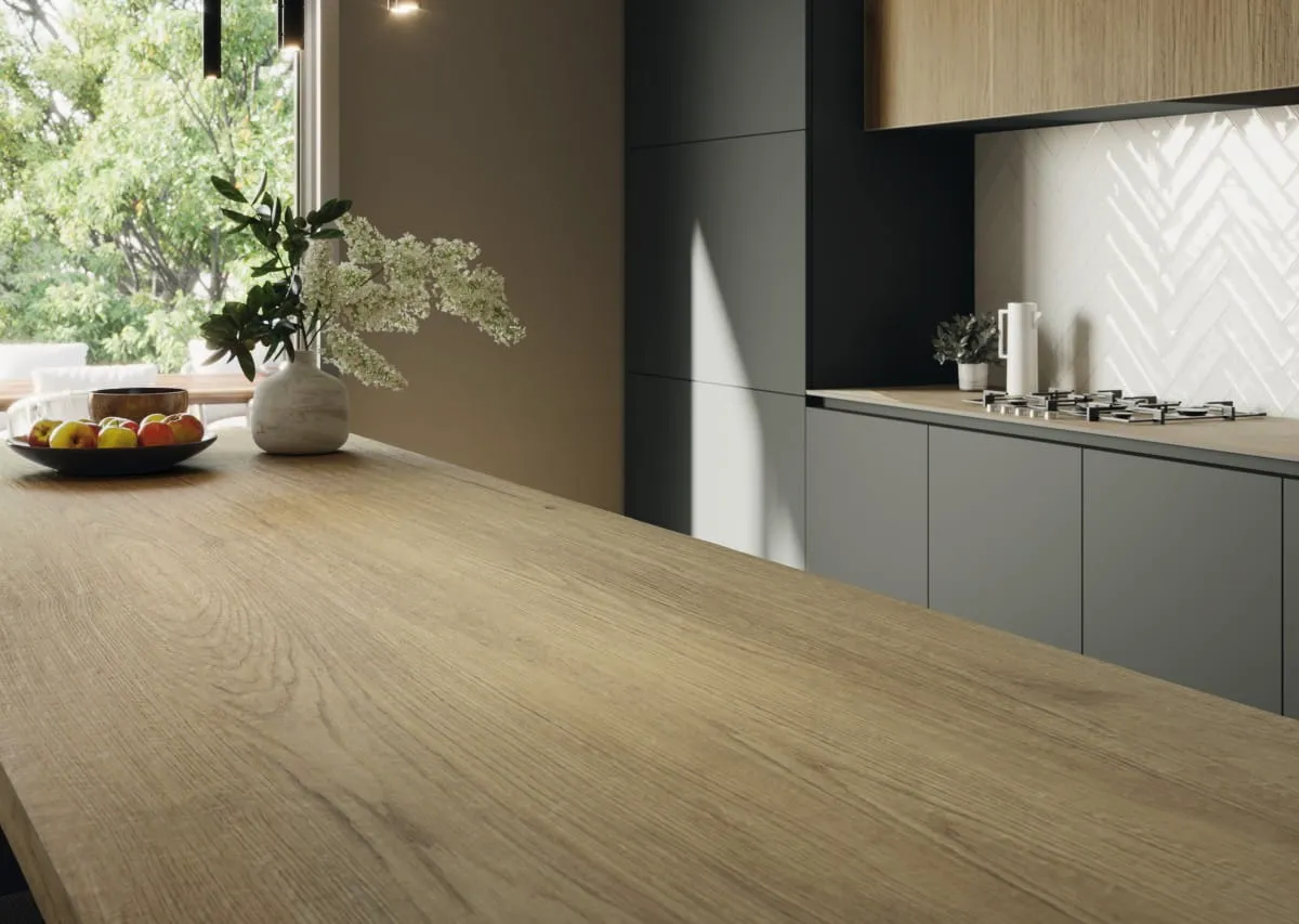 W kuchniach, łazienkach i przestrzeniach komercyjnych seria Jungla oferuje trwałe i atrakcyjne rozwiązanie na blaty. Łączy luksusowy wygląd drewna z odpornością na wilgoć, ciepło i zarysowania.