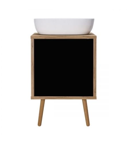 Szafka z płyty z powłoką lakierowaną na czarny mat, odporną na promieniowanie UV oraz płyty laminowanej kolor dąb. Z możliwością dopasowania nóżek, pełniących funkcję dekoracyjną (sprzedawane oddzielnie, wysokość z nogami 74 cm).