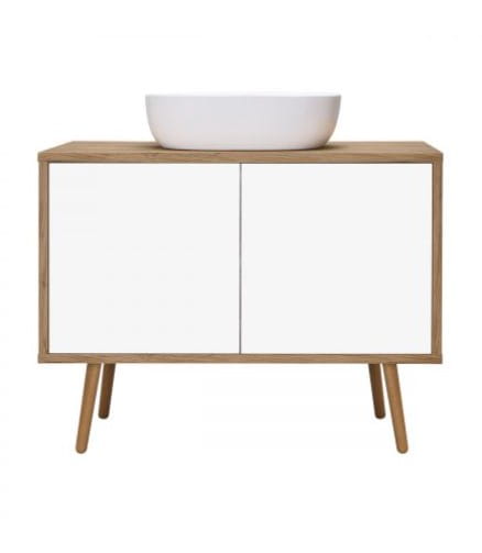 Szafka z płyty z powłoką lakierowaną na biało, odporną na promieniowanie UV oraz płyty laminowanej kolor dąb.