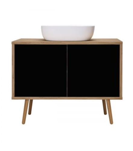 Szafka z płyty z powłoką lakierowaną na czarny mat, odporną na promieniowanie UV oraz płyty laminowanej kolor dąb.