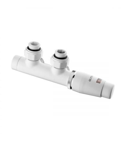 Kompletny zestaw zaworów do montażu grzejnika z podłączeniem środkowym o rozstawie 50 mm, zestaw składa się z bloku przyłączeniowego posiadającego wbudowany zawór termostatyczny, zawór odcinający oraz głowicę termostatyczną. Przystosowany zarówno do montażu w instalacjach C.O. wykonanych z rur miedzianych 15x1 jak i z tworzywa sztucznego PEX/AluPEX 16x2. Wszystkie elementy zestawu w kolorze spójnym z grzejnikami marki Oltens.
