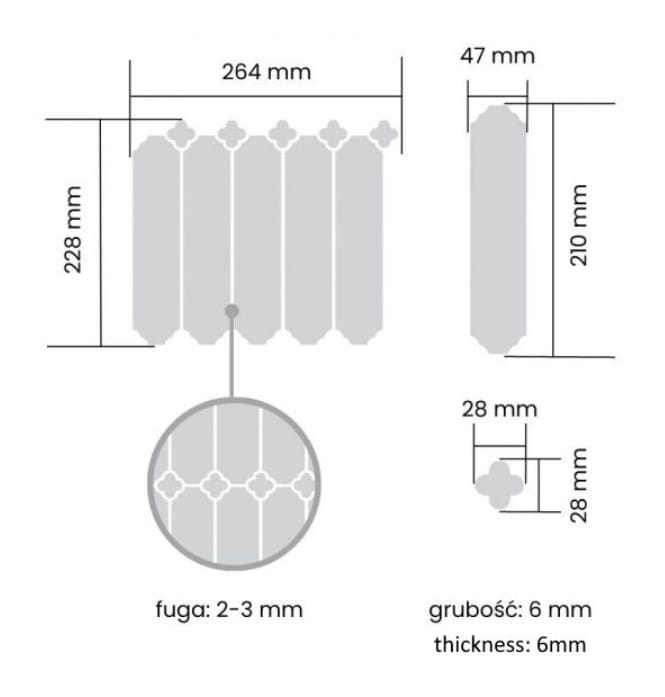 Kalibrowane krawędzie mozaiki zapewniają idealne wykończenie i piękny efekt po zafugowaniu, podkreślając precyzję wykonania.
