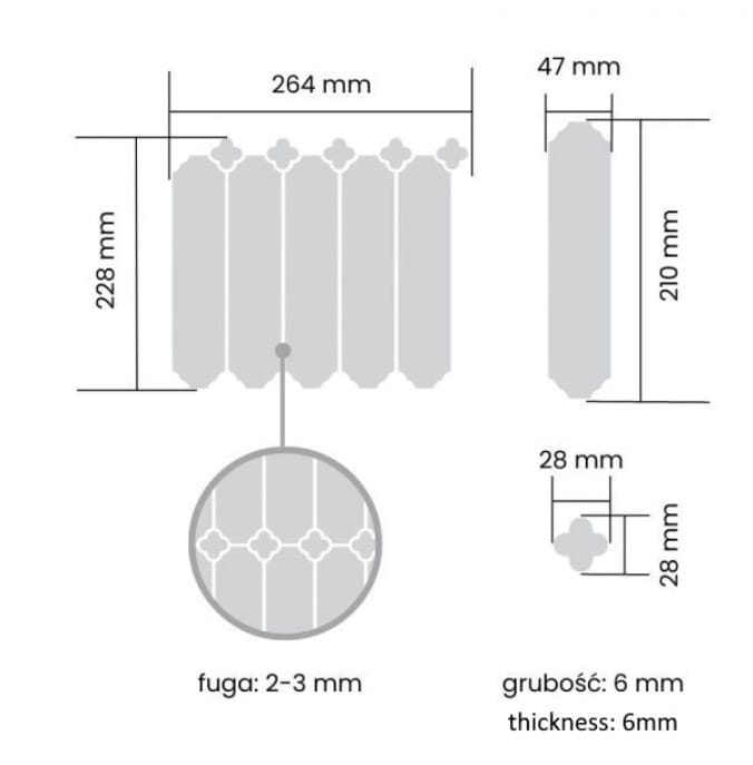Kalibrowane krawędzie mozaiki zapewniają idealne wykończenie i piękny efekt po zafugowaniu, podkreślając precyzję wykonania.