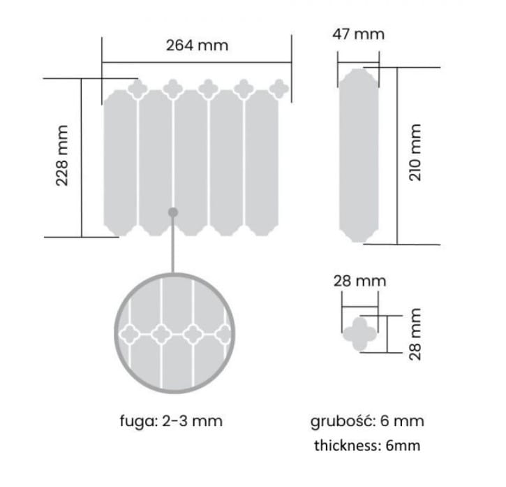 Kalibrowane krawędzie mozaiki zapewniają idealne wykończenie i piękny efekt po zafugowaniu, podkreślając precyzję wykonania.