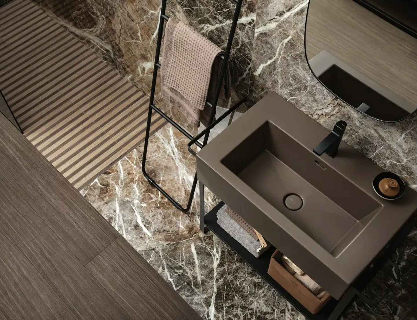Ciemniejsze drewno w łazience daje efekt elegancji i „hotelowego” stylu, szczególnie w połączeniu z czarną armaturą, szkłem i ciepłym światłem. Wielki format 120x280 cm pomaga uzyskać spójną okładzinę i ograniczyć liczbę fug w strefach użytkowych. To rozwiązanie dla osób, które chcą wprowadzić ciepło drewna do strefy mokrej, ale w bardziej nowoczesnej formie.