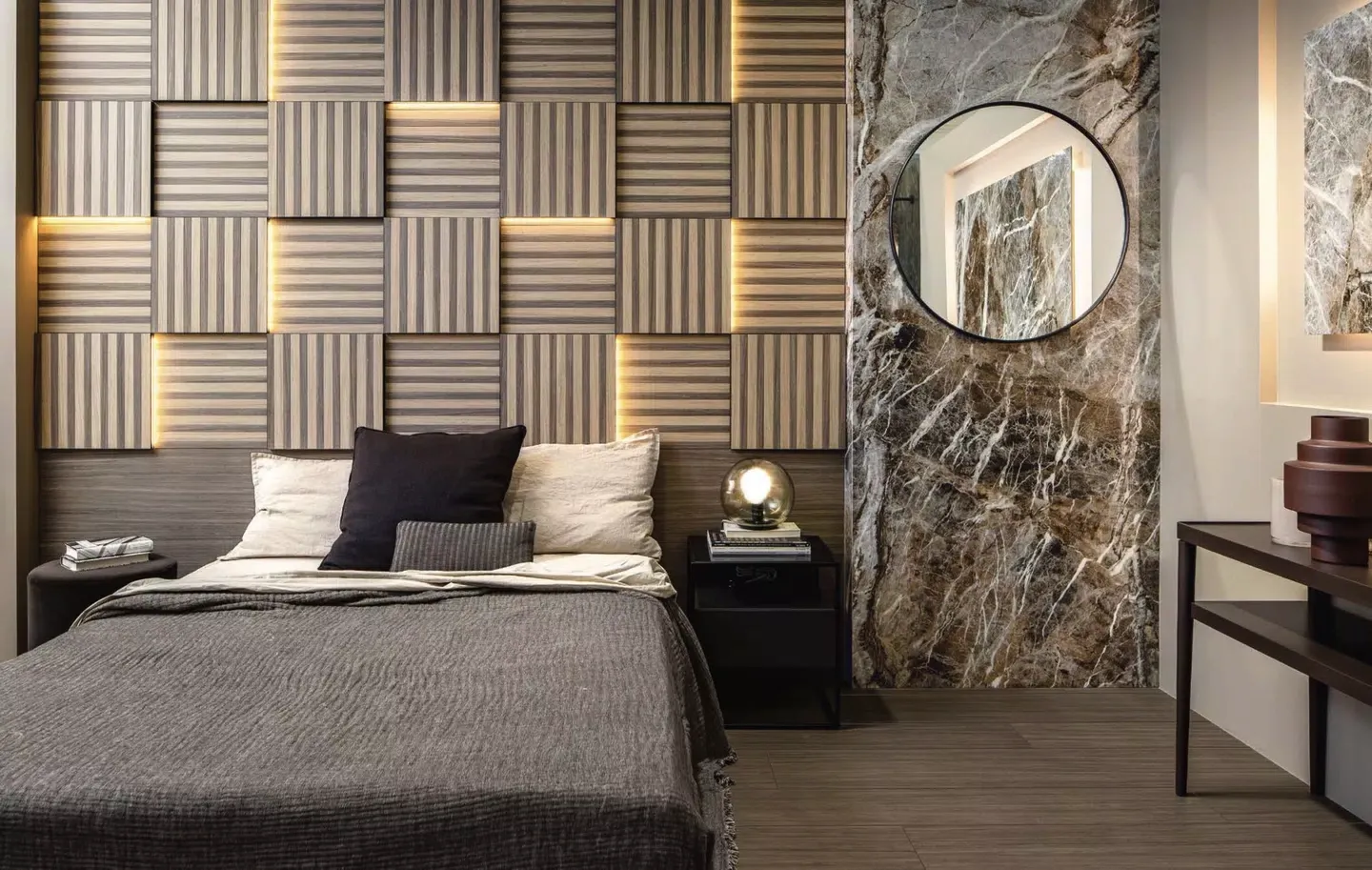 W salonie i holu ciemne drewno działa jak mocniejszy akcent: wprowadza głębię i podnosi odbiór wnętrza. Ten dekor świetnie wygląda na ścianie TV, przy kominku lub w strefie wejściowej, gdzie chcesz uzyskać „pierwsze wrażenie” premium. Duża płyta pomaga utrzymać nowoczesny, uporządkowany wygląd bez nadmiaru podziałów.