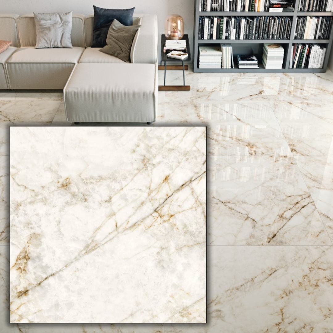 Wielkoformatowa płytka w rozmiarze 120x120 imitująca marmur. Doskonała na podłogi i ściany.