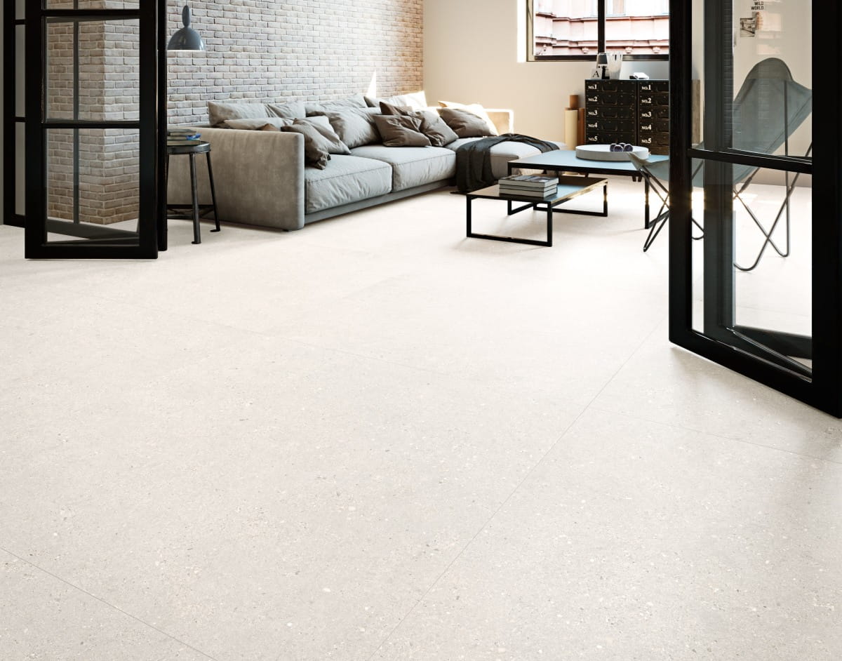 Płytka Distrito Marfil inspirowana jasnym metalem. Jej loftowy charakter nada wnętrzu miejskiego designu.